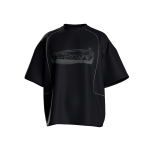 Czarna, bawełniana koszulka, przeszycie overlock oraz szary nadruk na froncie